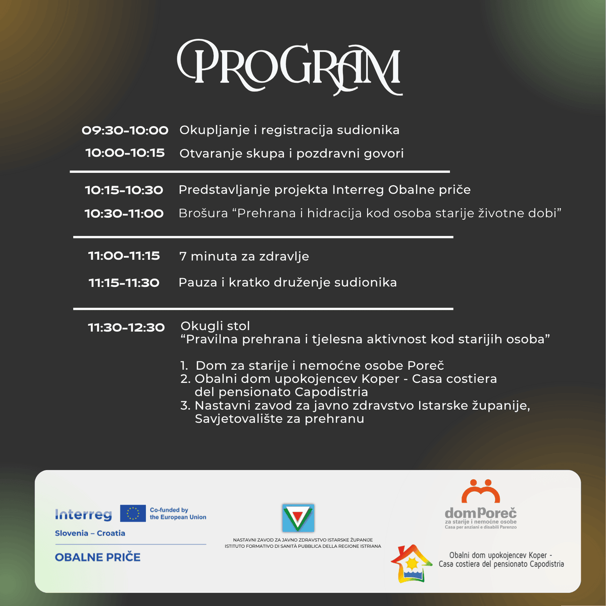 U petak, 10. listopada 2025. godine, s početkom u 10:00 sati u Zajednici Talijana Pula - Comunità degli Italiani di Pola održat će se javno predstavljanje EU projekta „Obalne priče“, u organizaciji Nastavnog zavoda za javno zdravstvo Istarske županije kao vodećeg partnera. Na predstavljanju će sudjelovati i partneri u projektu: Dom za starije i nemoćne osobe Poreč (HR) i Obalni dom upokojencev Koper (SLO). Na početku će biti prezentiran sam projekt i njegove aktivnosti (prekogranični događaji u Kopru i Poreču: vježbe i savjetovanje stručnjaka, degustacija tradicionalnih jela brošura o prehrani). Slijedit će predstavljanje brošure “Prehrana i hidracija kod osoba starije životne dobi” koju su pripremile nutricionistkinje Nastavnog zavoda za javno zdravstvo Istarske županije (osim hrvatskog prevedeno na talijanski i slovenski) te okrugli stol na temu pravilne prehrane i tjelesne aktivnosti kod starijih osoba. Na javno predstavljanje pozvane su udruge umirovljenika, domovi za starije osobe te zainteresirani građani.